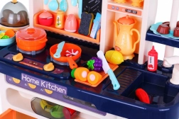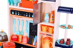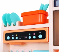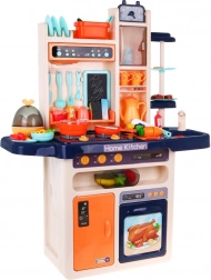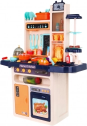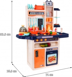 Diese stylische blaue Küche macht das Kochspiel zu einem realistischen Erlebnis. Kinder lieben das fließende Wasser aus dem funktionalen Hahn, die beleuchteten Kochfelder mit Brat- und Kochgeräuschen und ein Kochfeld mit feinem Dampfeffekt. Dazu kommen öffnender Backofen und Kühlschrank, eine Dunstabzugshaube mit Licht und ein Musik-/Audiopanel, eine Uhr mit beweglichen Zeigern sowie praktische Ablagen.