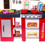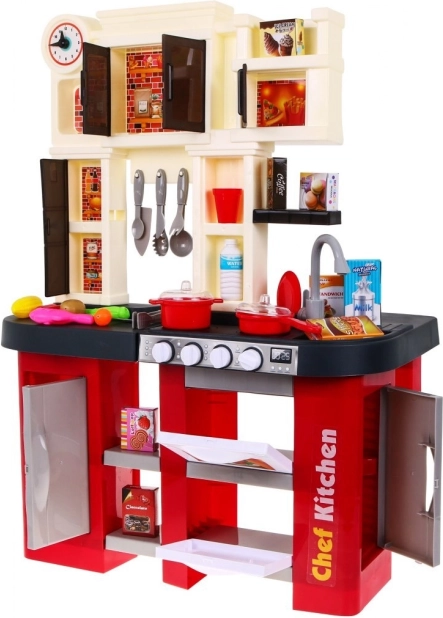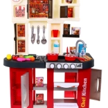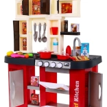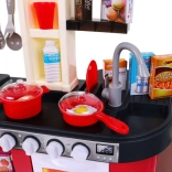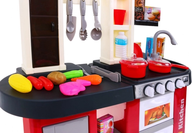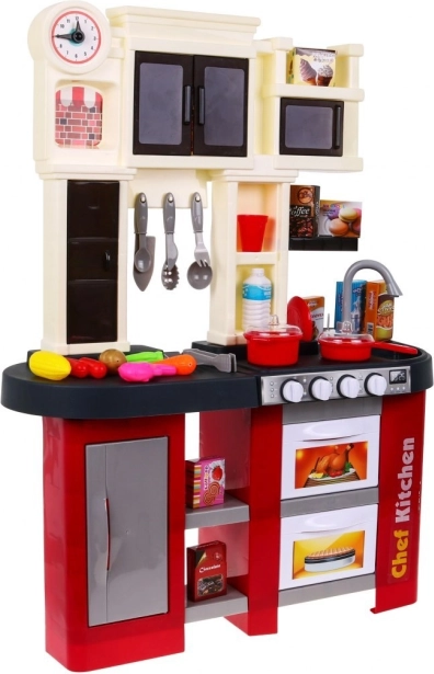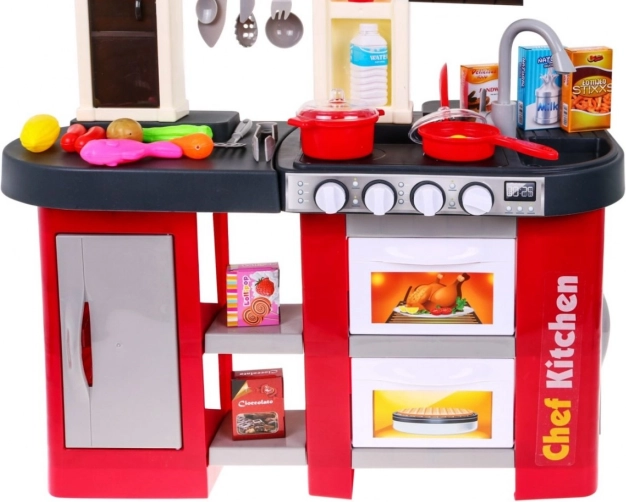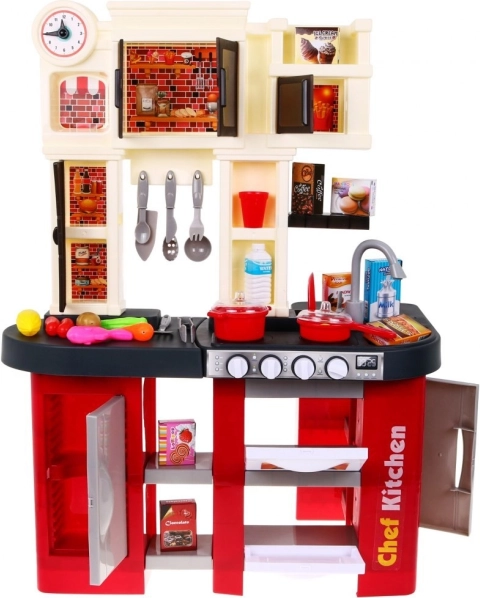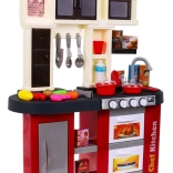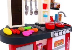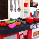Diese geräumige Kinderküche aus Kunststoff im rot‑schwarzen Design bietet Kindern ab 3 Jahren ein authentisches Kocherlebnis. Reale Lichteffekte und Koch- und Bratgeräusche beim Drehen der Knöpfe fördern kreatives Spiel und die Motorik. Enthalten ist auch ein funktionierender Wasserhahn, der den Spaß auf ein neues Level hebt.