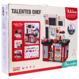 Die zu öffnende Backröhre, der Kühlschrank und die Aufbewahrungsschränke bieten viel Platz für Geschirr und Lebensmittel. Das Set umfasst 58 Elemente, darunter Töpfe, Pfannen, Utensilien und Lebensmittelattrappen – so wird im Handumdrehen eine komplette Küche nachgespielt.