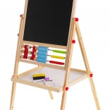 Über der Tafel befinden sich ein Abakus, eine Lernguhr mit Zeigern und dreh- bzw. schiebbare mathematische Elemente für erste Rechenaufgaben. Das untere Ablagefach hält alle Hilfsmittel in Reichweite. Das Spiel mit der Tafel fördert Feinmotorik, Konzentration, vorschulische Kompetenzen und Fantasie.