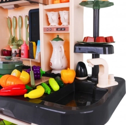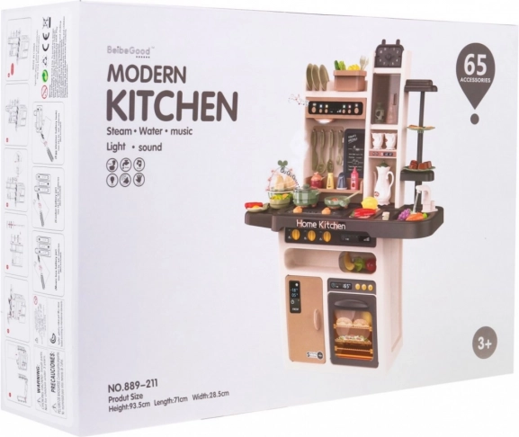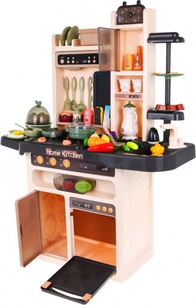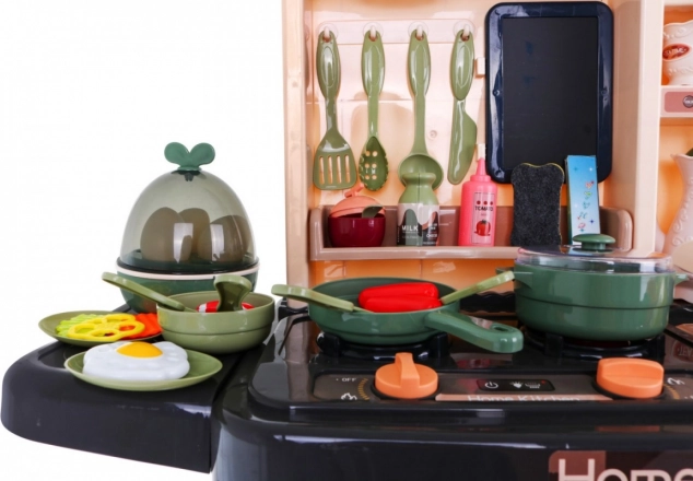 Die Kinderküche kommt mit 65 Zubehörteilen, einschließlich Eiöfen mit Effekten, Töpfen, Pfannen und einer Vielzahl von Plastiklebensmitteln wie Eier und Gemüse.