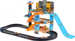 Dieser große und robuste Parkturm bietet vier Ebenen voller Spaß. Auf der obersten Ebene befindet sich ein Hubschrauberlandeplatz, während nach unten eine spaßige Rutsche für kleinere Autos führt. Jede Etage hat Parkplätze und auf der zweiten Etage befindet sich eine Rampe nach unten. In der unteren Etage finden Sie eine Waschanlage, eine Tankstelle und eine bewegliche Serviceplattform. Jede Etage ist über einen von Hand betriebenen leistungsstarken Aufzug erreichbar.