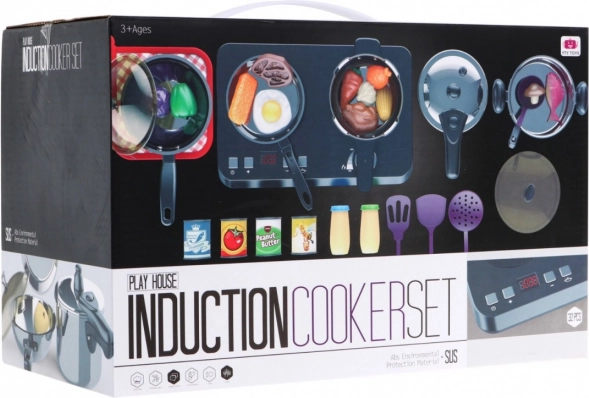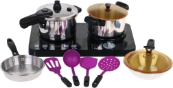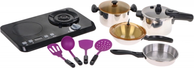 | Ein großartiges, hervorragend ausgestattetes Küchen-Set, bestehend aus einem Induktionskochfeld, Töpfen und Kochzubehör, ist für Kinder ab drei Jahren geeignet. Pfanne, Topf und Schnellkochtopf sehen aus wie echte, nur in Miniaturausführung. Das Induktionskochfeld wird mit 3 AA-Batterien 1,5 V betrieben (nicht im Lieferumfang enthalten) und ist mit Sound- und Lichteffekten ausgestattet. Auf der linken Seite befindet sich ein beleuchteter Brenner mit Kochgeräuschen und ein Panel zur Einstellung der Kochzeit von 2 bis 20 Minuten. Rechts gibt es einen beleuchteten Brenner mit Bratgeräuschen und einen Ein/Aus-Knopf. Im Set sind auch Spiel-Lebensmittel enthalten. | ||
