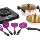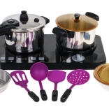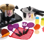 Ein großartiges, hervorragend ausgestattetes Küchen-Set, bestehend aus einem Induktionskochfeld, Töpfen und Kochzubehör, ist für Kinder ab drei Jahren geeignet. Pfanne, Topf und Schnellkochtopf sehen aus wie echte, nur in Miniaturausführung. Das Induktionskochfeld wird mit 3 AA-Batterien 1,5 V betrieben (nicht im Lieferumfang enthalten) und ist mit Sound- und Lichteffekten ausgestattet. Auf der linken Seite befindet sich ein beleuchteter Brenner mit Kochgeräuschen und ein Panel zur Einstellung der Kochzeit von 2 bis 20 Minuten. Rechts gibt es einen beleuchteten Brenner mit Bratgeräuschen und einen Ein/Aus-Knopf. Im Set sind auch Spiel-Lebensmittel enthalten. | ||
