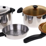 - Induktionskochfeld, - Schnellkochtopf, - Topf mit Deckel, - Pfanne, - Wok mit Deckel, - Schöpflöffel, - Seiher, - 2 x Spachtel, - Topfuntersetzer, - Hähnchen, - Steak, - Kohl, - Hähnchenschenkel, - Maiskolben, - Pilze, - Knoblauch, - Grüner Pfeffer, - Karotte, - Fisch, - Spiegelei, - Salzstreuer, - Pfefferstreuer, - Erdnussbutter, - Sardinen, - Tomatensoße, - Honig. | ||
