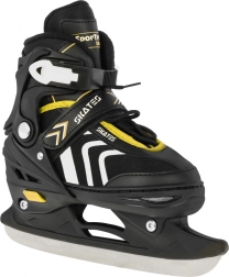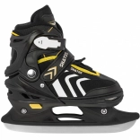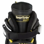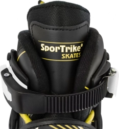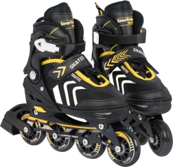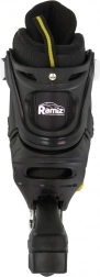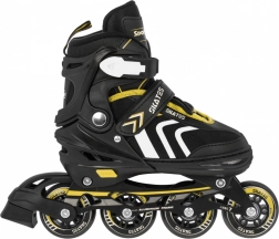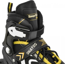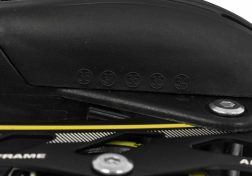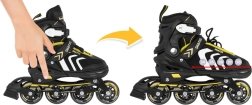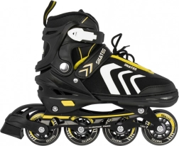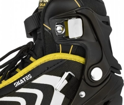 Der Schuh verfügt über effektive Belüftung, eine semipermeable Membran und eine profilierte Einlage mit weichem EVA-Schaum, überzogen mit samtigem Velvet-Material. Der dreifache Verschluss (Schnürung, Klettband, Schnalle mit Sicherung) hält den Fuß stabil. Der Aluminiumrahmen mit PU-Rollen 70×24 mm, Härte 85A, und ABEC-7-Lagern bietet eine ruhige, schnelle Fahrt; der rechte Inlineskate ist mit einer Bremse ausgestattet.