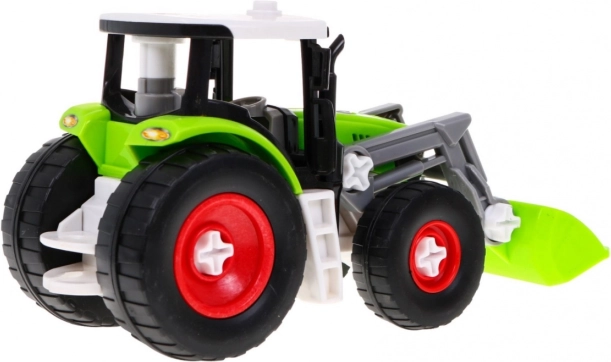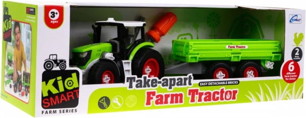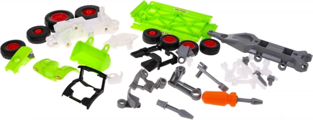 Der Traktor und Anhänger können dank der mitgelieferten Bohrmaschine mit zwei Aufsätzen leicht zerlegt und wieder zusammengebaut werden.