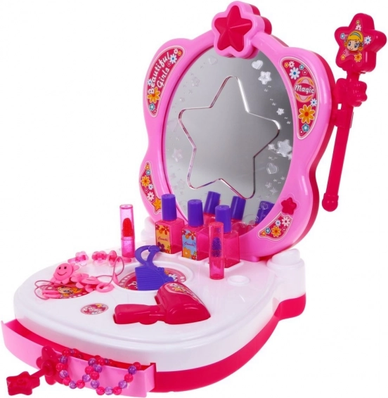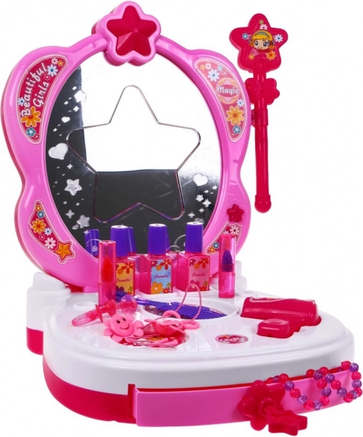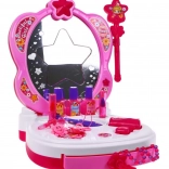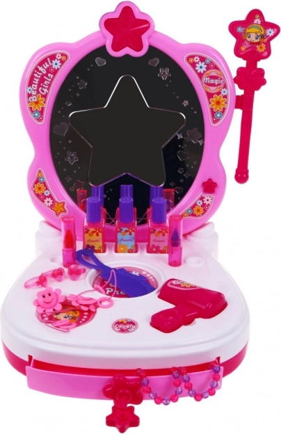 Diese interaktive rosa Schminkkommode mit Sternspiegel lässt jedes Kinderzimmer erstrahlen. Der Spiegel leuchtet in drei Farben (Blau, Rot, Rosa) und eine Auswahl von vier Melodien sorgt für magische Stimmung. Dank des umfangreichen Zubehörs können Kinder ihre Lieblingsrituale rund um Schönheit spielerisch nachahmen und in die Welt fantasievollen Schminkens und Frisierens eintauchen.