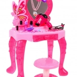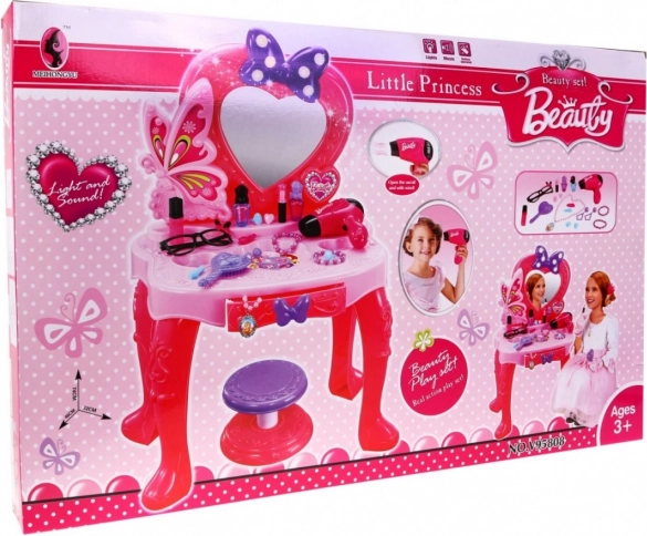 Die praktische Schublade verstaut alle Kleinigkeiten, während der beiliegende Hocker für bequemes Sitzen sorgt. Das umfangreiche Set aus Schmuck und kosmetischen Requisiten ermöglicht es Kindern, Stil zu entdecken und Feinmotorik sowie soziale Fähigkeiten beim gemeinsamen Spiel zu entwickeln.