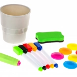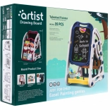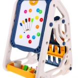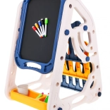 Die doppelseitige Tafel bietet auf einer Seite eine weiße magnetische Oberfläche für das Schreiben mit Stiften und das Anbringen von Magneten, während die andere Seite eine schwarze Kreidefläche zum Zeichnen ist. Dank speziellem Kreidehalter bleiben Kinderhände sauber.