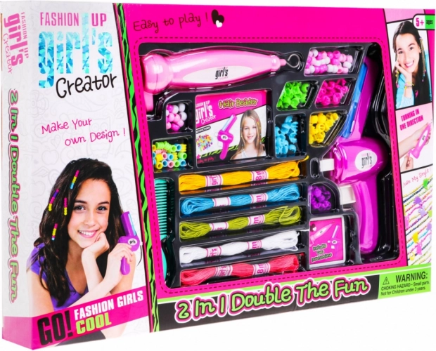 Kreatives 2-in-1-Set für kleine Designerinnen und Designer, das das Verzieren der Haare mit Perlen und das Gestalten von Armbändern verbindet. Dank mehr als 100 Deko-Elementen, praktischen Einfädel- und Flechtwerkzeugen sowie farbigen Schnüren entstehen originelle Schmuckstücke ganz nach kindlicher Fantasie.