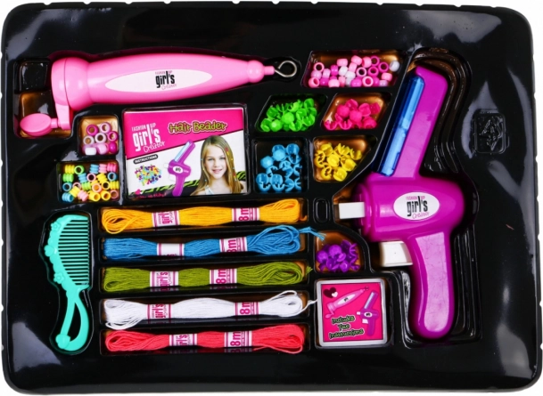 Komplette Ausstattung zum Verzieren der Haare und zum Herstellen von Armbändern und Halsketten – Perlen, Ringe, Buchstaben, Schnüre, Kamm sowie praktische Werkzeuge für müheloses Basteln.
