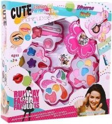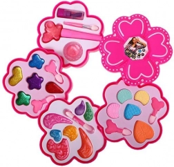 Aufklappbare rosa Kassette mit Kinderschminke für kleine Stylistinnen ab 3 Jahren bietet eine sichere und kreative Unterhaltung. Beinhaltet Lidschatten in verschiedenen Texturen, Lippenstift, Lipgloss, Nagellack und praktische Applikatoren. Das kompakte Blütendesign ist ideal für unterwegs und als Geschenk.