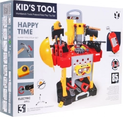 Komplettes Kinder-Set für kleine Heimwerker mit 3-in-1: Werkbank, Werkzeugkoffer und Bauleiter-Kostüm. Im Set sind 85 Teile realistische Kunststoffwerkzeuge und Zubehör enthalten, darunter Akku-Bohrmaschine/Schraubendreher (2× AA, nicht enthalten), Helm, Schutzbrille und Masken. Ideal zur Förderung der Feinmotorik, für kreatives Spiel und sicheres Kennenlernen von Werkzeugen für Kinder ab 3 Jahren.