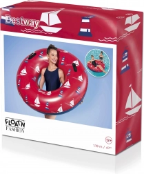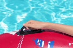 Das praktische Sicherheitsventil erleichtert das Aufblasen und verhindert Luftverlust. Die rote Farbe mit Segelboot- und Leuchtturmmotiven verleiht einen originellen Stil, der in jedem Pool auffällt.