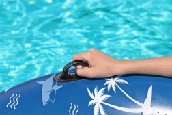 Der aufblasbare BESTWAY-Schwimmreifen mit tropischem Hai- und Palmenmotiv ist ideal für den Pool oder ruhige Seeflächen. Der große Durchmesser von 119 cm bietet bequemen Halt, während zwei integrierte Griffe das Aufsteigen und Festhalten auch beim Toben erleichtern.