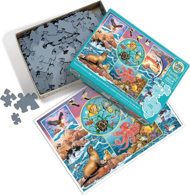 Die ungewöhnliche Form der Teile und die Stanzung, die kein Standardraster kopiert, bringen eine natürliche Herausforderung und ein abwechslungsreicheres Puzzleerlebnis. Das fertige Bild mit Ozeanmotiv begeistert durch Details und Farben – und erreicht aufgebaut eine Größe von ca. 67,6 × 48,9 cm.