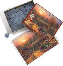 Der COBBLE HILL Stanzschnitt folgt nicht dem klassischen Raster, sodass Ecken und Kanten nicht immer in einer Achse liegen. Das erhöht den Spaß und die Abwechslung beim Puzzeln. In der Packung finden Sie außerdem eine farbige Vorlage im Format 31,6 × 22,9 cm, die bei der Orientierung im Motiv hilft.