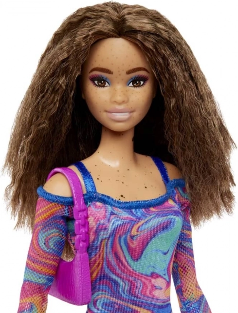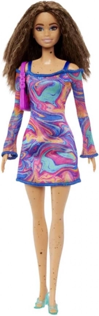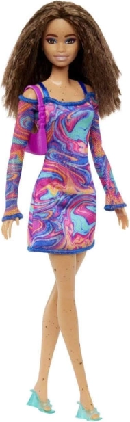Die Barbie Fashionistas Puppen bringen frischen Wind in Mode, Stil und Persönlichkeit. Diese Puppe verzaubert mit einem Wirbel aus Korallen-, Rosa- und Blautönen auf einem Kleid mit marmoriertem, regenbogenfarbenem Muster, Netzärmeln und trendigen Accessoires. Ideal für Kinder, die gerne Outfits kombinieren und eigene Geschichten erfinden.