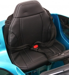 Sitz aus schwarzem Ökoleder mit Verstellung, Mehrpunktgurte sowie ein Audio-Panel mit MP3/USB/TF/AUX und Sounds am Lenkrad für maximalen Spaß.