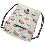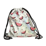 Dank des leichten Aufbaus und der festen Kordeln lässt er sich bequem auf dem Rücken tragen – ob zur Schule, in die Sporthalle oder auf einen Ausflug. Die holografische Oberfläche mit rosa Wassermelonen und Herzchen verleiht dem Beutel einen markanten und verspielten Stil.