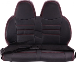 Doppelsitz aus ventilierter Eco-Leder-Polsterung mit Gurten, öffnende Türen mit Verriegelung und sanftes Anfahren. Ideal für bequeme und sichere Ausfahrten.