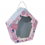 Der Vogel ist in einer schönen Geschenkbox mit Blumenmotiv verpackt, ideal für die Präsentation.