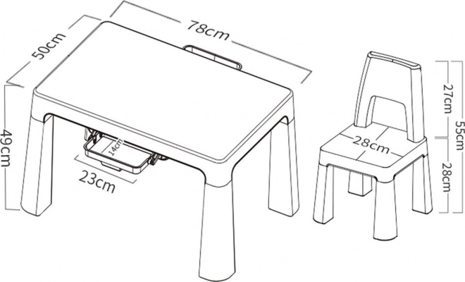 Der Kindertisch mit Stühlen FREEON Neo aus haltbarem Kunststoff ist eine großartige Ergänzung für jedes Kinderzimmer, Spielzimmer oder den Garten. Sein modernes Aussehen und sein praktischer Nutzen machen ihn zu einer idealen Wahl für kleine Künstler und Leser. Der Tisch ist mit zwei Schubladen der Größe 24 x 13 cm ausgestattet, ideal für die Aufbewahrung kleiner Gegenstände.