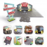 Ein Supermarkt mit Burger-Restaurant, Parkplatz und Beschilderung schafft eine authentische Szene, die Kinder ins Spiel zieht und ihre Fantasie anregt.