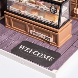 Die integrierte LED-Beleuchtung hebt die Vitrine mit Gebäck hervor und verleiht dem Modell eine realistische, warme Stimmung. Es werden 2× AAA-Batterien benötigt.