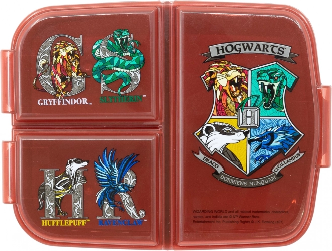 Die stylische Brotzeitbox in Rot begeistert kleine Fans von HARRY POTTER. Drei separate Fächer helfen, Hauptgericht, Obst und kleine Leckereien übersichtlich zu trennen, sodass sich Geschmäcker und Gerüche nicht vermischen. Die robuste Ausführung hält dem täglichen Gebrauch und kleineren Stößen stand.