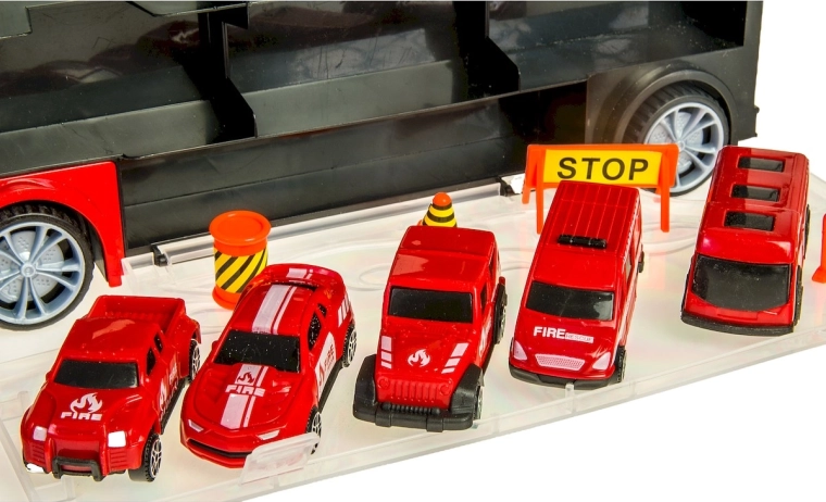 Im Lieferumfang enthalten sind 5 Feuerwehrfahrzeuge und ein Hubschrauber, ergänzt durch Verkehrsschilder und Kegel für noch realistischere Szenarien. Robuste Kunststoffausführung und leichtes Design sorgen für sicheres, komfortables Spielen und einfaches Mitnehmen dank des praktischen Griffs.