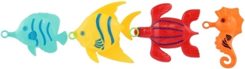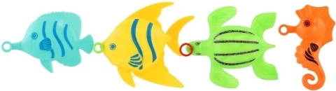 Das Set enthält 4 farbenfrohe Fischchen, die die kindliche Fantasie anregen und zum Spielen und Wettangeln motivieren – wer fängt sie am schnellsten?