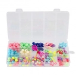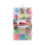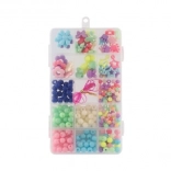 Das Set enthält verschiedene Formen und Größen von Perlen in leuchtenden Farben, die zur Gestaltung origineller Armbänder und Halsketten inspirieren.
