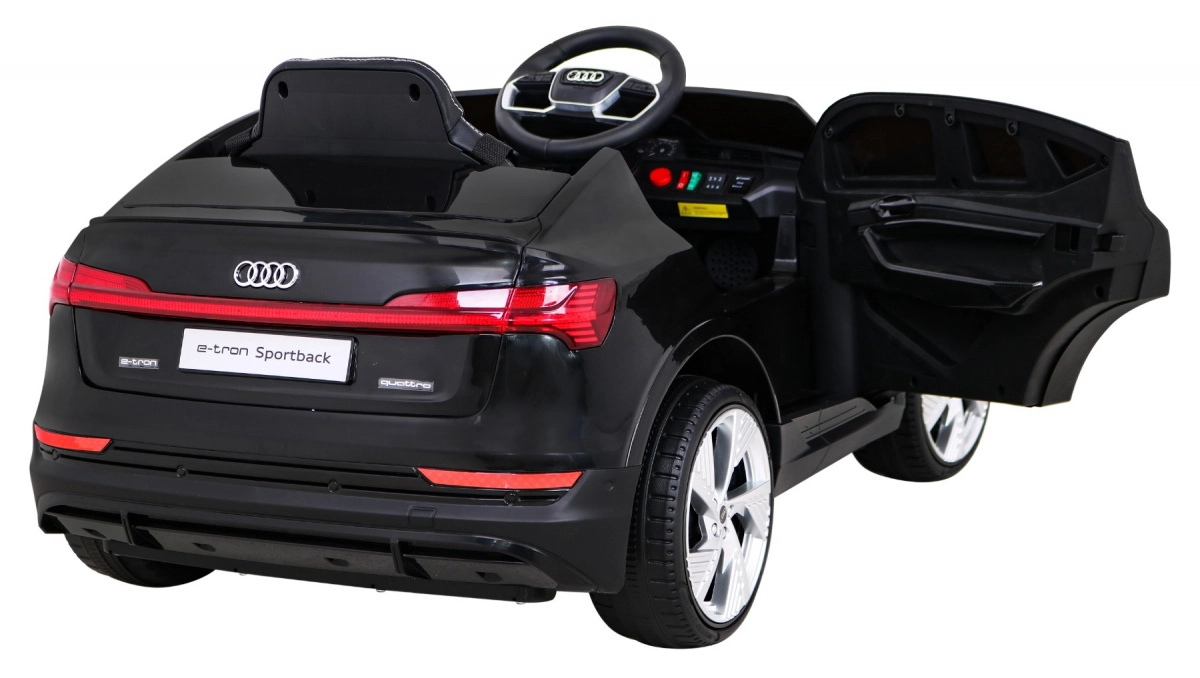 Detailgetreue Karosserie, funktionale LED-Leuchten und AUDI-Embleme vermitteln den Eindruck eines echten e-tron Sportback im Kinderformat.
