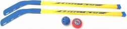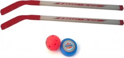 Das Set enthält einen Hockeyschläger aus Kunststoff, einen Kunststoffball und einen Puck.