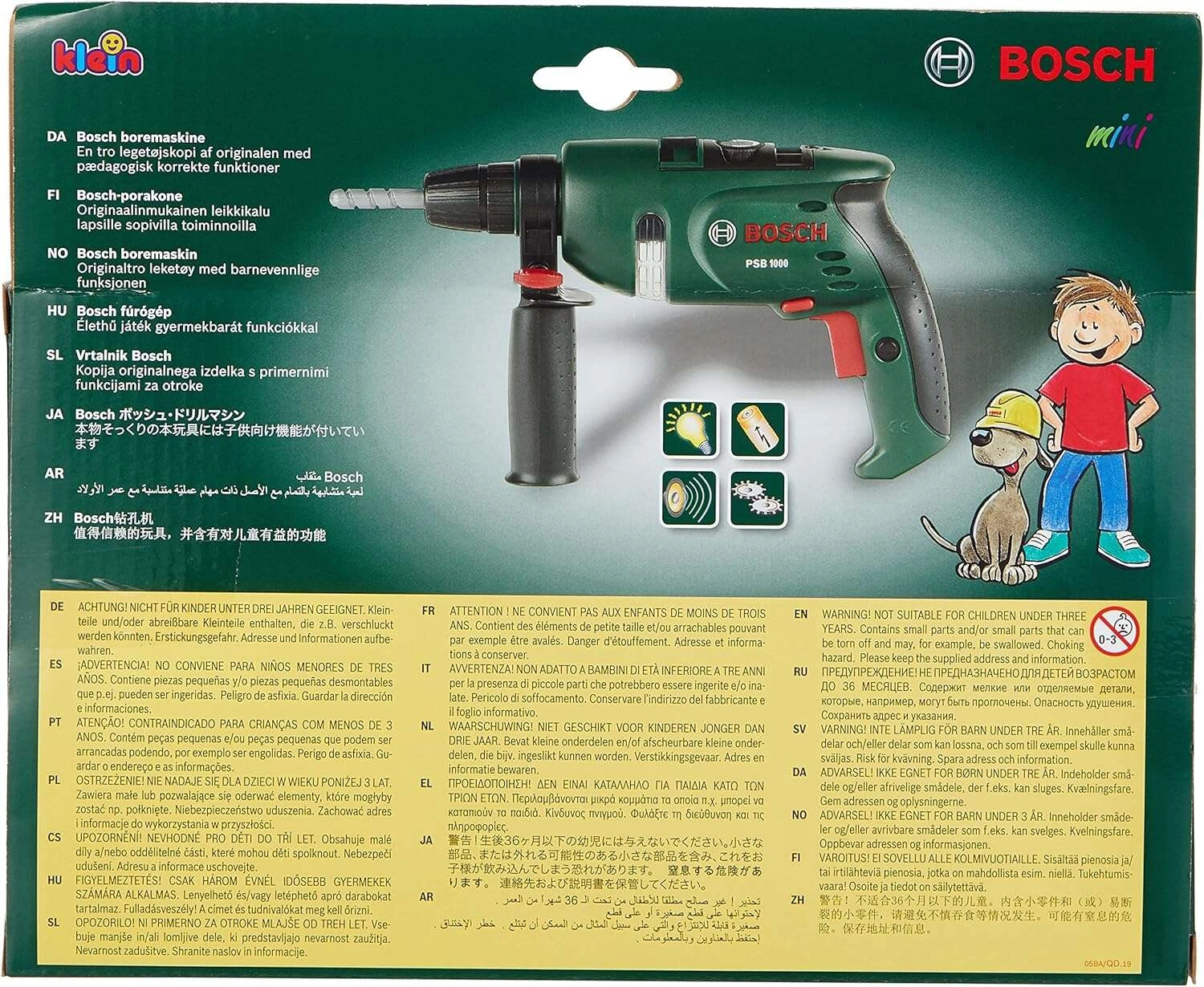 Diese Kinderbohrmaschine in ikonischem Bosch-Grün imitiert ein echtes Werkzeug und bietet Kindern ein unterhaltsames und sicheres Rollenspiel als Handwerker. LED-Licht und realistischer Sound beim Betätigen des Auslösers verstärken das Spielerlebnis und fördern Fantasie sowie Motorik.