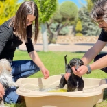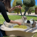 Das durchdachte Design mit sicheren, abgerundeten Kanten verhindert Anknabbern, während praktische Drainagerillen ein Überlaufen vermeiden. Der Pool ist stapelbar, um Platz zu sparen, und dank des Griffs lässt er sich bequem überallhin mitnehmen – in den Hof, auf die Terrasse oder auf Reisen mit Tieren.