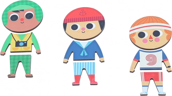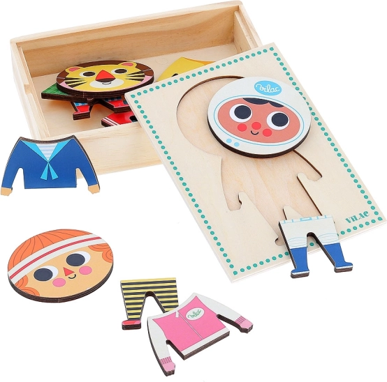 Das Vilac Anziehpuzzle Jules ist ein Holzspielzeug, ideal zur Förderung der Motorik, Beobachtungsgabe und Kreativität von Kindern. Es enthält 18 Teile, die es ermöglichen, insgesamt 6 Grundoutfits zu gestalten. Kinder können die einzelnen Teile mischen und so eine unendliche Anzahl von Kombinationen erstellen: