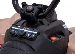 Kleine Fahrer freuen sich über realistische LED-Beleuchtung vorne und hinten, einfache Vorwärts-/Rückwärtssteuerung und einen sicheren sanften Start. Der ergonomische Sitz aus schwarzem Eco-Leder (40 × 23 cm) bleibt auch bei längeren Fahrten bequem. Das Multimedia-Panel spielt Lieblingslieder via Bluetooth, USB, MP3 und AUX ab und bietet zudem FM-Radio. Selbstverständlich mit Ladezustandsanzeige, Motor-Startgeräuschen und hinterem Transportgriff.