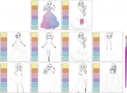 8 schwarz-weiße Bilder, Pinsel, 6 Wasserfarben