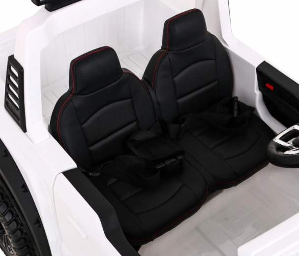 Komfort bieten Sitze aus Kunstleder mit Sicherheitsgurten sowie eine dreistufige Einstellung für die ideale Sitzposition. Die 2,4-GHz-Fernbedienung bietet 3 Geschwindigkeiten und eine STOP-Taste zum sofortigen Anhalten. Umfangreiche LED-Beleuchtung an Karosserie, Rahmen und Innenraum, zu öffnende Türen und ein funktionsfähiges Audio-Panel (MP3/USB/AUX) schaffen ein realistisches Erlebnis. Zudem gibt es Federung vorne und hinten für eine ruhige Fahrt.
