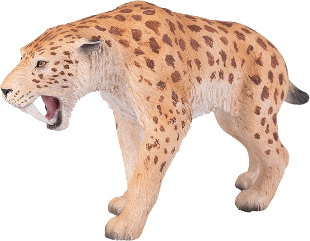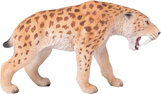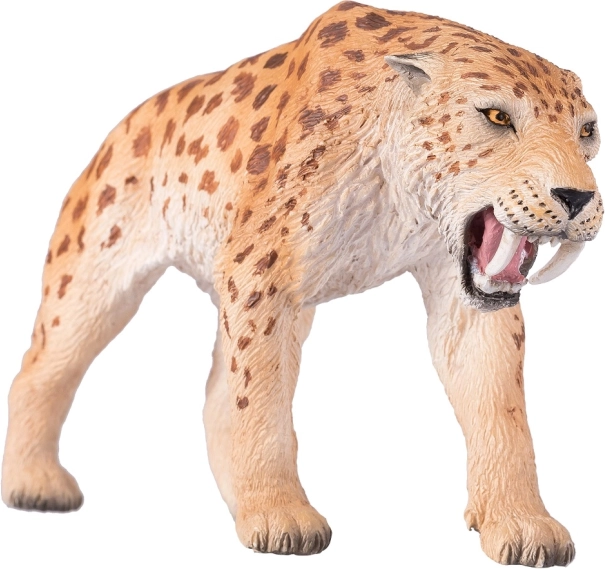 Diese Figur zeigt die authentischen Merkmale eines Säbelzahntigers, einschließlich seiner charakteristischen langen Eckzähne.