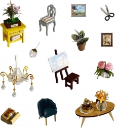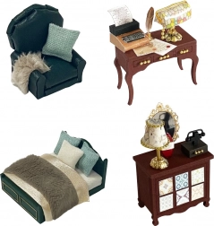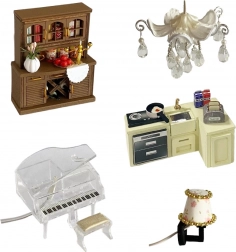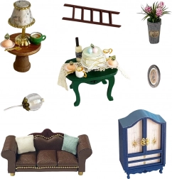 Enthalten sind miniaturhafte Möbelstücke und Dekorationen, die sich leicht zusammenbauen und arrangieren lassen. Jedes Detail unterstreicht den realistischen Look des fertigen Modells.