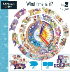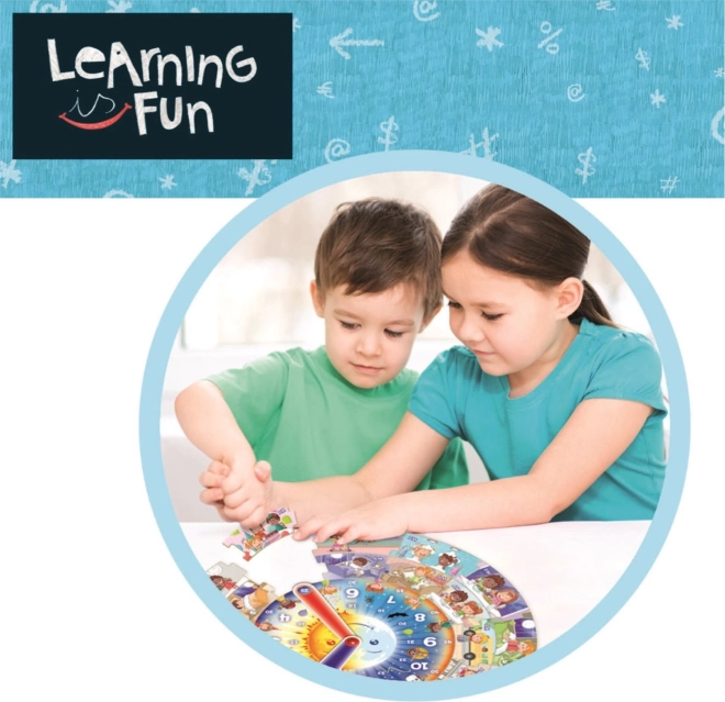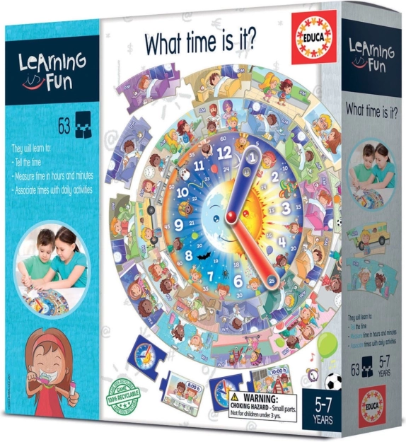 Educa Lernen macht Spaß hilft Kindern, tägliche Fähigkeiten im Umgang mit Uhren zu erlernen und führt sie in Aktivitäten während des Tages ein. Das Spiel enthält ein großes, rundes Puzzle mit 39 Teilen und eine Uhr mit Zeigern, was das logische Denken und die Feinmotorik integriert.