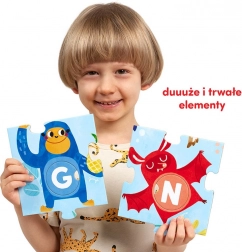 Die Tasche ist riesig, farbenfroh und wunderschön illustriert, was zum Buchstabenerkennen inspiriert und viele verschiedene entwicklungsfördernde Aktivitäten ermöglicht. Das Puzzeln ist nur eine davon. Der beigefügte Leitfaden ist voll von Ideen für lehrreiche Spiele, die auf das Alter und die Fähigkeiten des Kindes abgestimmt sind. Das Puzzle eignet sich hervorragend sowohl für den häuslichen als auch für den Kindergartenbereich.