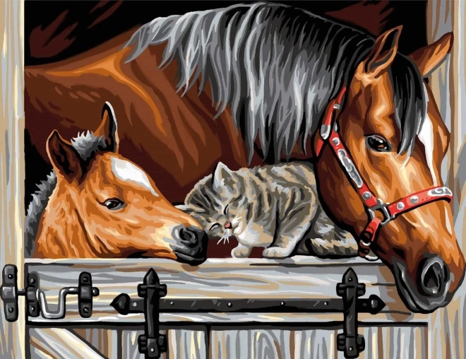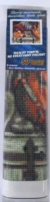 Diamantmalerei ist ein kreativer Spaß für alle, der stundenlange, angenehme Entspannung bietet. Mit dem Applikationsstift kleben Sie kleine „Diamant“-Steinchen auf die markierten Stellen der Leinwand und erschaffen nach und nach ein funkelndes Bild mit dem Motiv Pferde und Katze. Es sind keine künstlerischen Fähigkeiten erforderlich – folgen Sie einfach der Symbollegende.