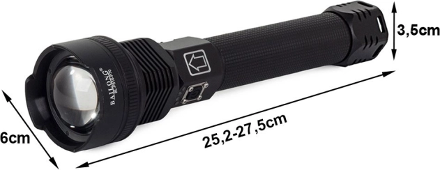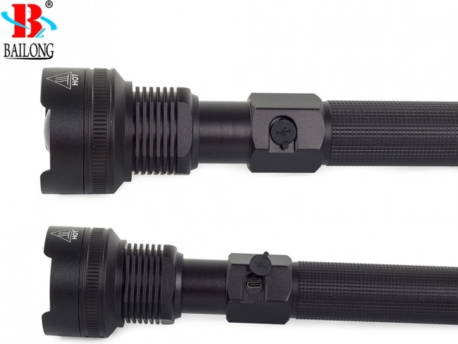Leistungsstarke taktische BAILONG‑Taschenlampe mit CREE XHP70 für zuverlässige Beleuchtung im Gelände und zu Hause. Bietet Reichweite bis zu 1000 m, stufenlosen Zoom, 3 Leuchtmodi, ein robustes Gehäuse aus Flugzeugaluminium mit Schutzklasse IPX5, USB‑Laden, Betrieb mit 2× 26650 und LED‑Ladezustandsanzeige.