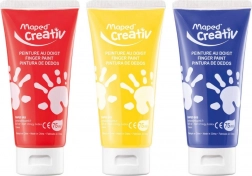 Das Set enthält drei Tuben Fingerfarben in leuchtenden Farben – Rot, Gelb und Blau. Die Farben sind ungiftig und sicher für Kleinkinder.