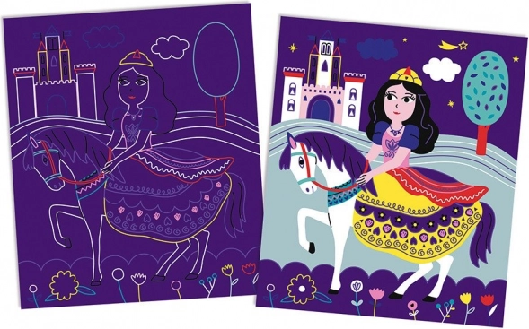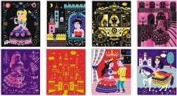 Das Set enthält acht vorgedruckte Karten mit Prinzessinnen, Schlössern und magischen Szenerien. Jedes Motiv inspiriert Kinder zum Gestalten und zum Erzählen eigener Geschichten.